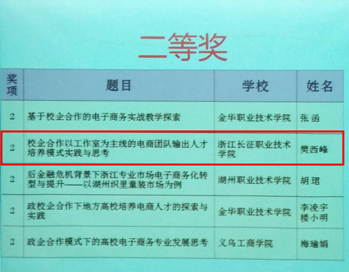 2015年1月17日,浙江省高职高专经济管理教指委电商分指委在湖州职业技术学院召开了2015年第一次教指委会议。会议的主题是“政校企合作,推动电商教学”,会议进行了论文征集和评比。我院电子商务专业樊西峰老师提交的论文“校企合作以工作室为主线的电商团队输出人才培养模式实践与思考”荣获二等奖,张琼老师提交的论文“大数据时代的杭州高校微商城构建途径探讨”荣获三等奖。(商务系供稿)