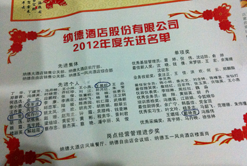 近日收到纳德酒店股份有限公司寄来的内部刊物纳德报(总第32期),该报第一版赫然入目的是纳德酒店股份有限公司2012年度先进名单,我院历届毕业生李军波、郑莺、王晨姣、侯存存、解超霞等同学均被评为先进个人;去年11月进入纳德自由店实习的10酒店管理班戴艳青同学被评为年度优秀实习生。