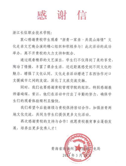 近日,青海省海西州文体旅游广电局给我校发来一封感谢信,对我校师生在由青海省文化和旅游厅、浙江省援青指挥部、海西蒙古族藏族自治州人民政府共同主办的“山宗水源 大美青海 魅力海西 —— 浙青一家亲 共筑山海情”文化走亲活动中给予的大力支持表示感谢,希望今后能继续与我校保持密切合作,加强浙青两地文化交流,共同为学生们提供更多文化活动。