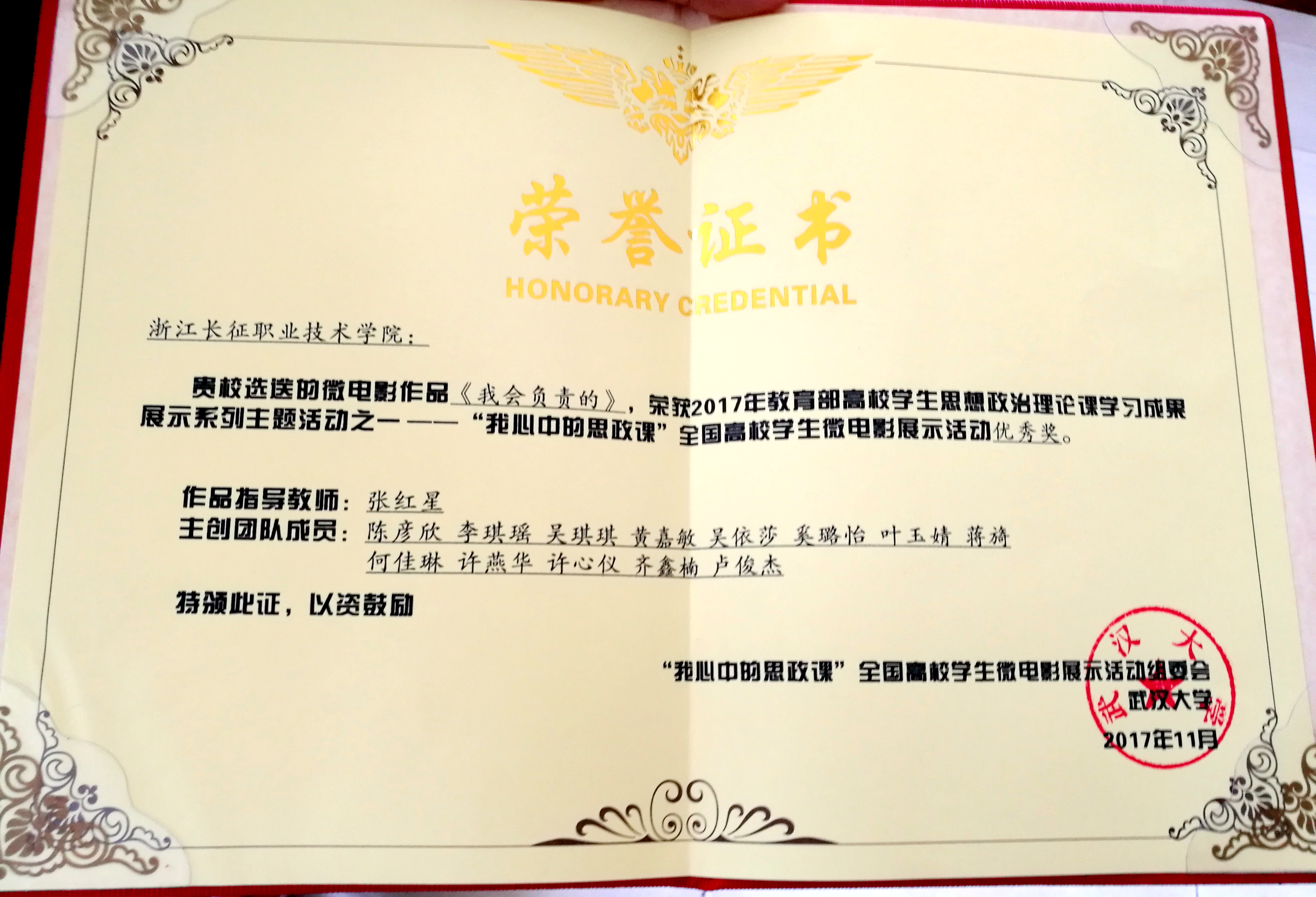 近日,2017年教育部高校学生思想政治理论课学习成果展示系列之—— “我心目中的思政课”全国高校学生微电影展示活动获奖证书集中下发。我校张红星老师指导的微电影作品《我会负责的》,在各省教育行政部门和全国重点马院报送的191项作品中脱颖而出,获得优秀奖。高校学生思想政治理论课学习成果展示系列主题活动由教育部社科司主办,旨在引导广大学生正确认识世界和中国发展大势,正确认识中国特色和国际比较,正确认识时代责任和历史使命,正确认识远大抱负和脚踏实地,不断坚定中国特色社会主义道路自信、理论自信、制度自信、文化自信。