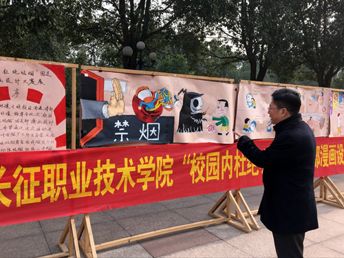 2015年12月15日中午,我院在图书馆前阶梯广场进行“校园内杜绝吸烟”海报、漫画设计大赛最后一次展览。执行院长吕振合教授、党委副书记王其军教授等学院领导参观了此次展览。
