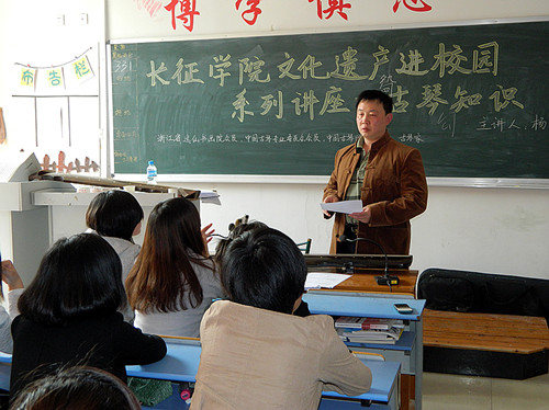 杨海老师为同学们讲解了古琴的历史、发展,弹琴的基本技巧以及古琴的指法和琴的外形特点等。在讲课的过程中杨老师贯穿几首著名的琴曲——《流水》,《平沙落雁》等,让同学们从琴声中感受古琴的魅力。接着,杨教授又用不同的琴弹奏同一个曲子,让同学们感受它们各自的韵味。最后在一曲《梅花三弄》中讲座落下帷幕。